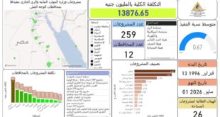 – الدكتور عبد العاطى : جهود ضخمة لتنمية الصعيد وتوفير حياة كريمة للمواطنين – العمل على تنفيذ (٢٥٩) مشروع بمحافظات الصعيد في مجالات تأهيل الترع والمساقى ، وتجديد المنشآت المائية ومحطات الرفع ، والحماية من السيول ، وحفر الآبار الجوفية ، وحماية جوانب نهر النيل – تأهيل ترع بأطوال ٢٦١٨ …