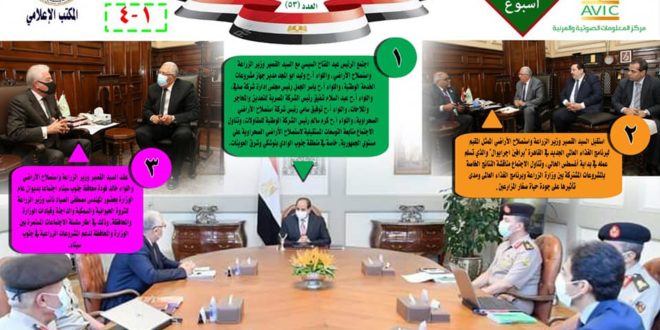 وأشار الانفوجراف إلى اجتماع الرئيس عبد الفتاح السيسي مع السيد القصير وزير الزراعة واستصلاح الأراضي، واللواء أ.ح وليد ابو المجد مدير جهاز مشروعات الخدمة الوطنية، واللواء أ.ح ياسر الجمل رئيس مجلس إدارة شركة صافي، واللواء أ.ح عبد السلام شفيق رئيس الشركة المصرية للتعدين والمحاجر والملاحات، واللواء أ.ح توفيق سامي رئيس شركة استصلاح الأراضي الصحراوية، واللواء أ.ح كرم سالم رئيس الشركة الوطنية للمقاولات، ونناول الاجتماع “متابعة التوسعات المستقبلية لاستصلاح الأراضي الصحراوية علي مستوي الجمهورية، خاصةً في منطقة جنوب الوادي بتوشكي وشرق العوينات”.