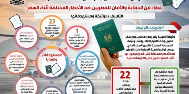 وأوضح التقرير أن هذه الوثيقة التأمينية يتم إصدارها لكل جواز سفر مصري، بهدف توفير تغطية تأمينية لأبناء الوطن ضد الأخطار المختلفة التي قد يتعرضون لها خلال 90 يوماً متتالية من سفرهم للخارج، حيث تشارك بها 22 شركة تأمين، بحسب بيان صادر عن مجلس الوزراء.
