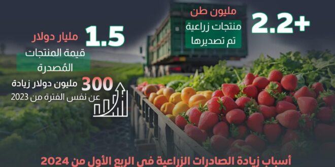 أعلن السيد القصير، وزير الزراعة واستصلاح الأراضي، تجاوز الصادرات الزراعية المصرية 2.2 مليون طن منتجات زراعية في الربع الأول من 2024، بحوالي 1.5 مليار دولار بزيادة قدرها 300 مليون دولار عن نفس الفترة من العام السابق.