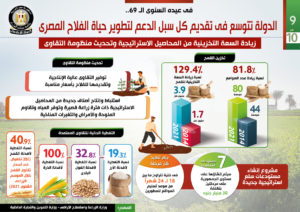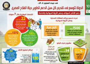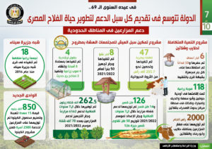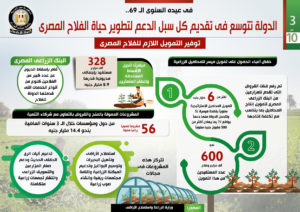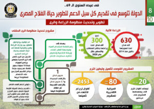 وفي هذا الصدد نشر المركز الإعلامي لمجلس الوزراء تقريراً تضمن إنفوجرافات تسلط الضوء على جهود الدولة في تقديم كل سبل الدعم لتطوير حياة الفلاح المصري.