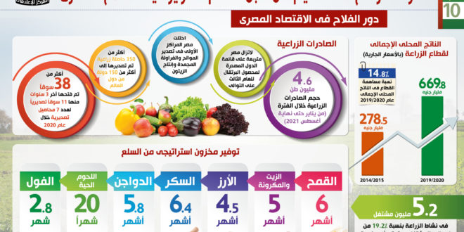 وأظهر التقرير الدور الذي يلعبه الفلاح ومدى مساهمته في توفير مخزون استراتيجي من السلع، مشيراً إلى أن مدة تغطية القمح تبلغ 6 أشهر، والزيت والمكرونة 5 أشهر، والأرز 4.5 شهر، والسكر 6.4 شهر، والدواجن 5.8 شهر، واللحوم الحية 20 شهراً، والفول 2.8 شهر.