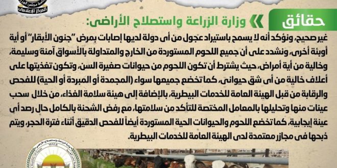 انتشر في بعض المواقع الإلكترونية وصفحات التواصل الاجتماعي أنباء حول استيراد لحوم أبقار مصابة بمرض “جنون الأبقار” وطرحها بالأسواق، وقد قام المركز الإعلامي لمجلس الوزراء بالتواصل مع وزارة الزراعة واستصلاح الأراضي، والتي نفت تلك الأنباء، مُؤكدةً أنه لا صحة لاستيراد لحوم أبقار مصابة بمرض “جنون الأبقار” وطرحها بالأسواق، وأنه لا يسمح باستيراد عجول من أي دولة لديها إصابات بمرض “جنون الأبقار” أو أية أوبئة أخرى، مُشددةً على أن جميع اللحوم المستوردة من الخارج والمتداولة بالأسواق آمنة وسليمة، وخالية من أية أمراض، حيث يشترط أن تكون اللحوم من حيوانات صغيرة السن، وتكون تغذيتها على أعلاف خالية من أي شق حيواني، كما تخضع جميعها سواء (المجمدة أو المبردة أو الحية) للفحص والرقابة من قبل الهيئة العامة للخدمات البيطرية، بالإضافة إلى هيئة سلامة الغذاء، من خلال سحب عينات منها وتحليلها بالمعامل المختصة للتأكد من سلامتها، مع رفض الشحنة بالكامل حال رصد أي عينة إيجابية، كما تخضع اللحوم والحيوانات الحية المستوردة أيضاً للفحص الدقيق أثناء فترة الحجر، ويتم ذبحها في مجازر معتمدة لدى الهيئة العامة للخدمات البيطرية.