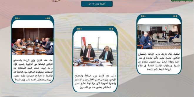 وترأس علاء فاروق وزير الزراعة واستصلاح الأراضي، والمهندس حسن الخطيب وزير الاستثمار والتجارة الخارجية لأول مرة لجنة تنظيم تصدير البطاطس بحضور عدد من المصدرين، كما عقد وزير الزراعة، اجتماعا مع وزيرة البيئة؛ لبحث كيفية الاستفادة من المخلفات والمتبقيات الزراعية سواء الناتجة عن الأنشطة الزراعية او الحيوانية وذلك بحضور المهندس مصطفى الصياد نائب وزير الزراعة.