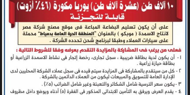 أعلنت شركة مصر لإنتاج الأسمدة (موبكو) عن طرح مزايدة عامة للبيع بالسوق المحلي المصري لعدد 10 آلاف طن من سماد اليوريا المكورة (46% أزوت)، قابلة للتجزئة، وذلك بنظام الأظرف المغلقة.