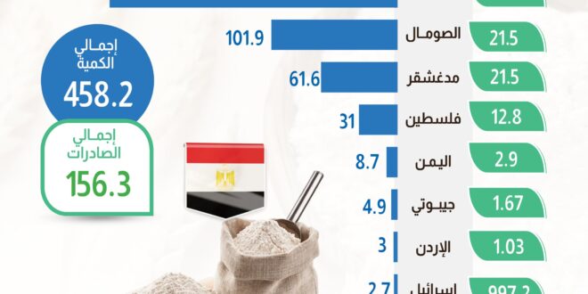 سجلت صادرات مصر من الدقيق ومنتجات المطاحن خلال النصف الأول من عام 2025 نحو 156.3 مليون دولار، بإجمالي كمية بلغت حوالي 458.2 ألف طن، وفق بيانات المجلس التصديري للصناعات الغذائية.