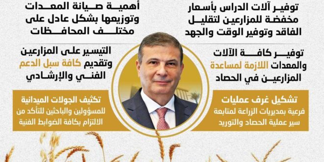 ● وزير الزراعة يوجه الزراعة الآلية بتوفير آلات وأدوات الحصاد للمزارعين بأسعار مناسبة لتقليل الفاقد وتوزيعها بشكل عادل على المحافظات