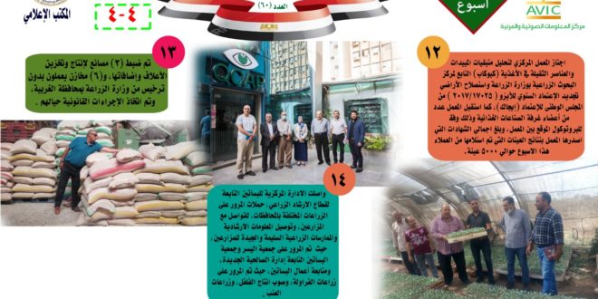 اصدر مركز المعلومات الصوتية والمرئية، التابع لوزارة الزراعة واستصلاح الاراضي، “الانفوجراف الاسبوعي” في نسخته رقم ٦٠، حول الحصاد الاسبوعي لأهم أنشطة الوزارة، خلال الاسبوع الماضي في الفترة من ٨ الى ١٤ اكتوبر الجاري، وذلك بالتعاون مع المكتب الاعلامي للوزارة، كما أصدر المركز ايضا ملخصا بالفيديو، حول انشطة الوزارة خلال نفس الفترة.
