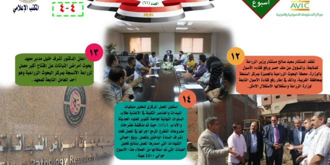 اصدر مركز المعلومات الصوتية والمرئية، التابع لوزارة الزراعة واستصلاح الاراضي، “الانفوجراف الاسبوعي” في نسخته رقم ٦١، حول الحصاد الاسبوعي لأهم أنشطة الوزارة، خلال الاسبوع الماضي في الفترة من ١٥ الى ٢١ اكتوبر الجاري، وذلك بالتعاون مع المكتب الاعلامي للوزارة، كما أصدر المركز ايضا ملخصا بالفيديو، حول انشطة الوزارة خلال نفس الفترة.