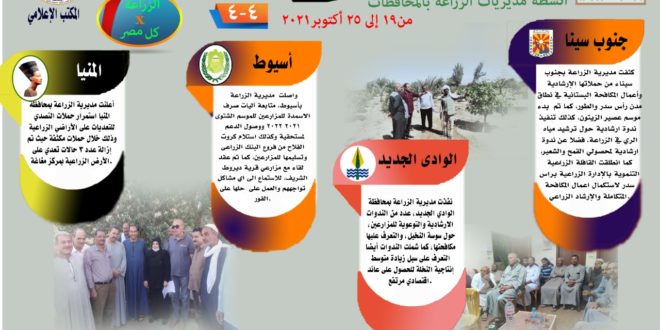 أصدر مركز المعلومات الصوتية والمرئية التابع لوزارة الزراعة واستصلاح الأراضي، والمكتب الاعلامي للوزارة، العدد رقم ١٢ من اصدار: “الزراعة في كل مصر” بالانفوجراف والفيديو، يوضح الجهود والانشطة التي تقوم بها مديريات الزراعة والطب البيطري بمحافظات الجمهورية خلال الفترة من ١٩ وحتى ٢٥ اكتوبر الجاري.