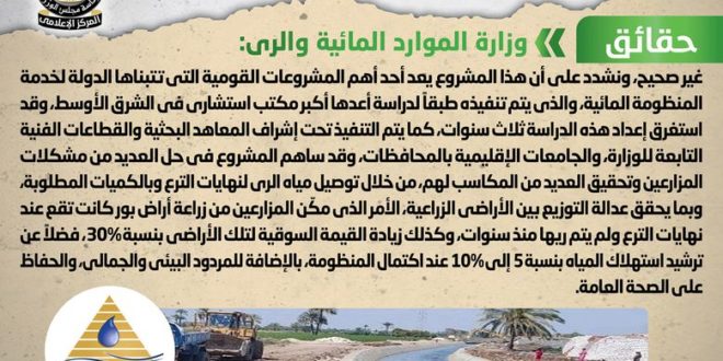 تداولت بعض وسائل الإعلام والمواقع الإلكترونية وصفحات التواصل الاجتماعي أنباء بشأن عدم جدوى المشروع القومي لتأهيل الترع، وقد قام المركز الإعلامي لمجلس الوزراء بالتواصل مع وزارة الموارد المائية والري، والتي نفت تلك الأنباء، مُؤكدةً أنه لا صحة لعدم جدوى المشروع القومي لتأهيل الترع، مُشددةً على أن هذا المشروع يعد أحد أهم المشروعات القومية التي تتبناها الدولة لخدمة المنظومة المائية، والذي يتم تنفيذه طبقاً لدراسة أعدها أكبر مكتب استشاري في الشرق الأوسط، وقد استغرق إعداد هذه الدراسة ثلاث سنوات، كما يتم التنفيذ تحت إشراف المعاهد البحثية والقطاعات الفنية التابعة للوزارة، والجامعات الإقليمية بالمحافظات، وقد ساهم المشروع في حل العديد من مشكلات المزارعين وتحقيق العديد من المكاسب لهم، من خلال توصيل مياه الري لنهايات الترع وبالكميات المطلوبة، وبما يحقق عدالة التوزيع بين الأراضي الزراعية، الأمر الذي مكّن المزارعين من زراعة أراض بور كانت تقع عند نهايات الترع ولم يتم ريها منذ سنوات، وكذلك زيادة القيمة السوقية لتلك الأراضي بنسبة 30%، فضلاً عن ترشيد استهلاك المياه بنسبة 5 إلى 10% عند اكتمال المنظومة، بالإضافة للمردود البيئي والجمالي، والحفاظ على الصحة العامة.