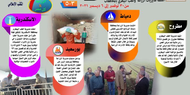 وكثفت مديرية الزراعة بمحافظة البحيرة حملات إزالة التعدي على الأراضي الزراعية، حيث تم ازالة 89 حالة، بمراكز المحافظة المختلفة، كما أعلنت مديرية الطب البيطرى بمحافظة الاسكندرية، تشكيل لجنة مكبرة من اطباء مديرية الطب البيطري و مباحث التموين و حي عامرية اول لاجراء التحصينات الوقائية بسوق طيبه 2 التابع لادارة العامرية و قد تم تحصين عدد 92 راس ماشية بلقاحي الحمي القلاعية و حمي الوادي المتصدع و ترقيمهم و سيتم المرور علي السوق اسبوعيا لاجراء التحصينات الوقائية.