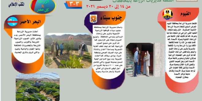 أصدر مركز المعلومات الصوتية والمرئية التابع لوزارة الزراعة واستصلاح الأراضي، والمكتب الاعلامي للوزارة، العدد رقم ٢٠ من اصدار: “الزراعة في كل مصر” بالانفوجراف والفيديو، يوضح الجهود والانشطة التي تقوم بها مديريات الزراعة والطب البيطري بمحافظات الجمهورية خلال الفترة من ١٤ وحتى ٢٠ ديسمبر الجاري الجاري.