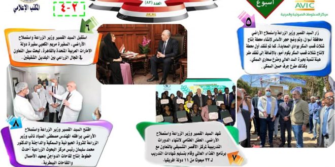 أصدر مركز المعلومات الصوتية والمرئية، التابع لوزارة الزراعة واستصلاح الأراضي، “الانفوجراف الأسبوعي” في نسخته رقم 82، حول الحصاد الاسبوعي لأهم أنشطة الوزارة، خلال الاسبوع الماضي في الفترة من 11 الى 17 مارس الجاري، وذلك بالتعاون مع المكتب الاعلامي للوزارة، كما أصدر المركز ايضا ملخصا بالفيديو، حول انشطة الوزارة خلال نفس الفترة.
