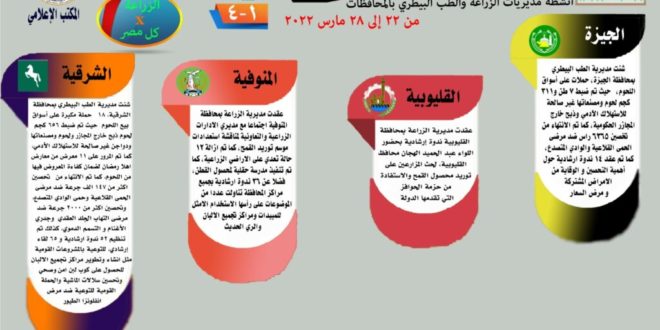 أصدر مركز المعلومات الصوتية والمرئية التابع لوزارة الزراعة واستصلاح الأراضي، والمكتب الإعلامي للوزارة، العدد رقم 34 من إصدار: “الزراعة في كل مصر” بالإنفوجراف والفيديو، يوضح الجهود والأنشطة التي تقوم بها مديريات الزراعة والطب البيطري بمحافظات الجمهورية خلال الفترة من 22 إلى 28 مارس الجاري.