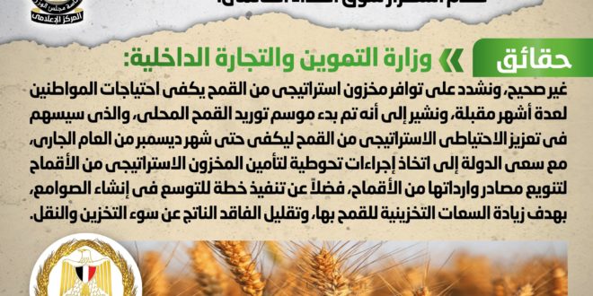 تداولت بعض المواقع الإلكترونية وصفحات التواصل الاجتماعي أنباء تزعم تأثر المخزون الاستراتيجي لمصر من الأقماح نتيجة لعدم استقرار سوق الغذاء العالمي، وقد قام المركز الإعلامي لمجلس الوزراء بالتواصل مع وزارة التموين والتجارة الداخلية، والتي نفت تلك الأنباء، مُؤكدةً أنه لا صحة لتأثر المخزون الاستراتيجي لمصر من الأقماح نتيجة لعدم استقرار سوق الغذاء العالمي، مُشددةً على توافر مخزون استراتيجي من القمح يكفي احتياجات المواطنين لعدة أشهر مقبلة، مُشيرةً إلى أنه تم بدء موسم توريد القمح المحلي، والذي سيسهم في تعزيز الاحتياطي الاستراتيجي من القمح ليكفي حتى شهر ديسمبر من العام الجاري، مع سعي الدولة إلى اتخاذ إجراءات تحوطية لتأمين المخزون الاستراتيجي من الأقماح لتنويع مصادر وارداتها من الأقماح، فضلاً عن تنفيذ خطة للتوسع في إنشاء الصوامع، بهدف زيادة السعات التخزينية للقمح بها، وتقليل الفاقد الناتج عن سوء التخزين والنقل.