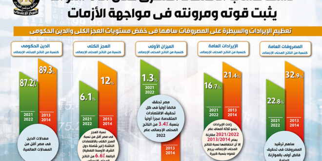يأتي هذا فيما، ازداد الناتج المحلي الإجمالي بالأسعار الجارية بأكثر من 3 أضعاف، حيث بلغ 7.9 تريليون جنيه (بيان مبدئي) عام 2021/2022، مقابل 2.2 تريليون جنيه عام 2013/2014.