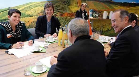 وفي مستهل زيارته لألمانيا وعلى هامش فعاليات المنتدي الدولي عقد المصيلحي مجموعة من اللقاءات الثنائية بحضور سعادة السيد / خالد جلال عبد الحميد السفير المصري بألمانيا وبدأت أولى هذه اللقاءات بمقابلة مع السيدة سيلفيا بندنر وزيرة الدولة للزراعة بألمانيا وأعرب الدكتور على المصيلحى عن امتنانه للتعاون المثمر بين مصر وألمانيا بشأن تصدير المانيا شحنتى قمح لمصر وعبر عن تطلع مصر لزيادة وارداتها من القمح والدقيق الألمانى على المستويين الحكومى والقطاع الخاص فى ضوء تنويع مصر لمصادر استيراد السلع لمواجهه الارتفاع المتضاعف لأسعار الدقيق والقمح عالميًا.