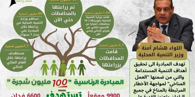 استمراراً لمتابعة مبادرة فخامة السيد رئيس الجمهورية “100 مليون شجرة” والتي تستهدف مضاعفة نصيب الفرد من المساحات الخضراء على مستوى الجمهورية وتحسين نوعية الهواء وتحقيق الإستفادة الإقتصادية القصوى من الأشجار، وتحسين الصحة العامة للمواطنين ، خاصة مع الاهتمام الحكومى من قِبل د.مصطفى مدبولى رئيس مجلس الوزراء لمواجهة التحديات و التغيرات المناخية التى تواجه مصر و غيرها من مختلف دول العالم .