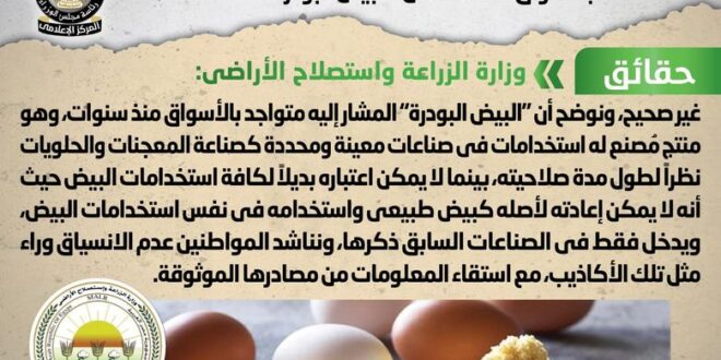 تداولت بعض المواقع الإلكترونية وصفحات التواصل الاجتماعي أنباء بشأن طرح الحكومة لمنتجات بديلة لبيض المائدة الطبيعي بالأسواق تحت مسمى “البيض البودرة”، وقد قام المركز الإعلامي لمجلس الوزراء بالتواصل مع وزارة الزراعة واستصلاح الأراضي، والتي نفت تلك الأنباء مُؤكدةً أنه لا صحة لطرح الحكومة لمنتجات بديلة لبيض المائدة الطبيعي بالأسواق تحت مسمى “البيض البودرة”، موضحةً أن “البيض البودرة” المشار إليه متواجد بالأسواق منذ سنوات، وهو منتج مُصنع له استخدامات في صناعات معينة ومحددة كصناعة المعجنات والحلويات نظراً لطول مدة صلاحيته، بينما لا يمكن اعتباره بديلاً لكافة استخدامات البيض حيث أنه لا يمكن إعادته لأصله كبيض طبيعي واستخدامه في نفس استخدامات البيض، ويدخل فقط في الصناعات السابق ذكرها، مناشدةً المواطنين عدم الانسياق وراء مثل تلك الأكاذيب، مع استقاء المعلومات من مصادرها الموثوقة.