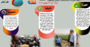 أصدر (مركز المعلومات الصوتية والمرئية) التابع لوزارة الزراعة واستصلاح الأراضي، والمكتب الاعلامي للوزارة، العدد رقم ١٦ من اصدار: “الزراعة في كل مصر” بالانفوجراف والفيديو، يوضح الجهود والانشطة التي تقوم بها مديريات الزراعة والطب البيطري بمحافظات الجمهورية خلال الفترة من ١٦ الى ٢٢ نوفمبر الجاري الجاري. واشار الملخص الى انتهاء مديرية …